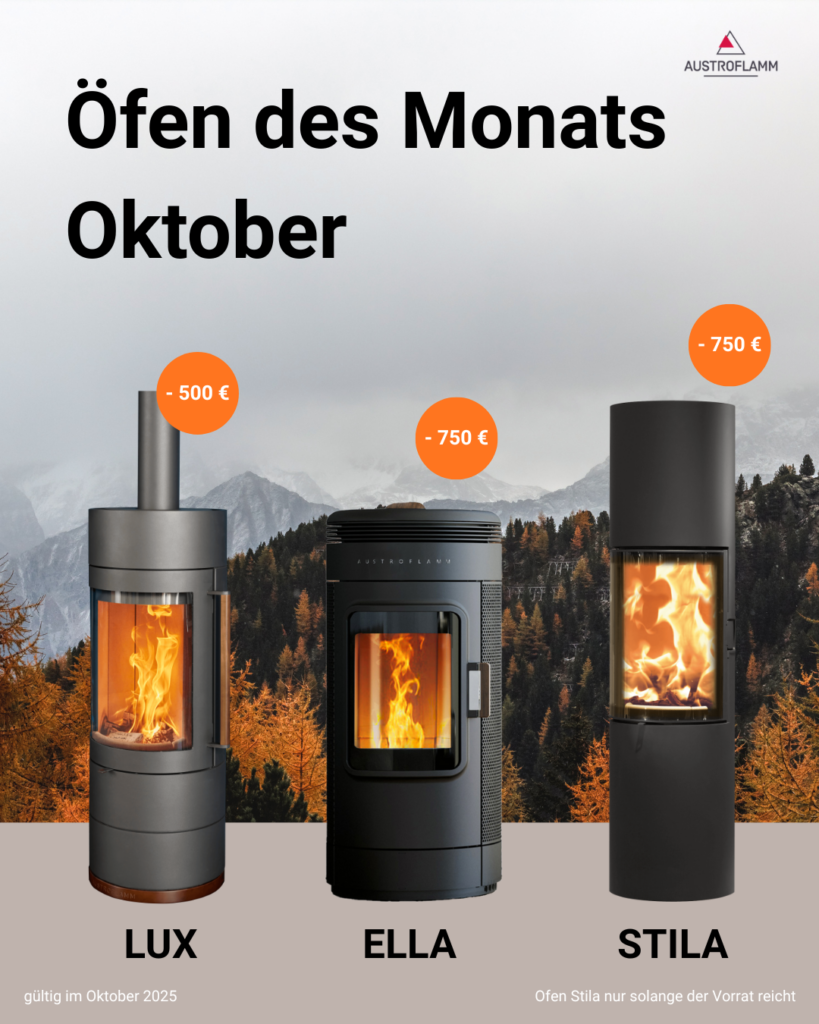 Wir sind Teilnehmer der Herbstaktion von Austroflamm. Daher erhalten Sie bei uns im Oktober 2025 gleich drei Öfen des Monats zum Aktionspreis: Holzofen Lux, Pelletofen Ella und Holzofen Stila.